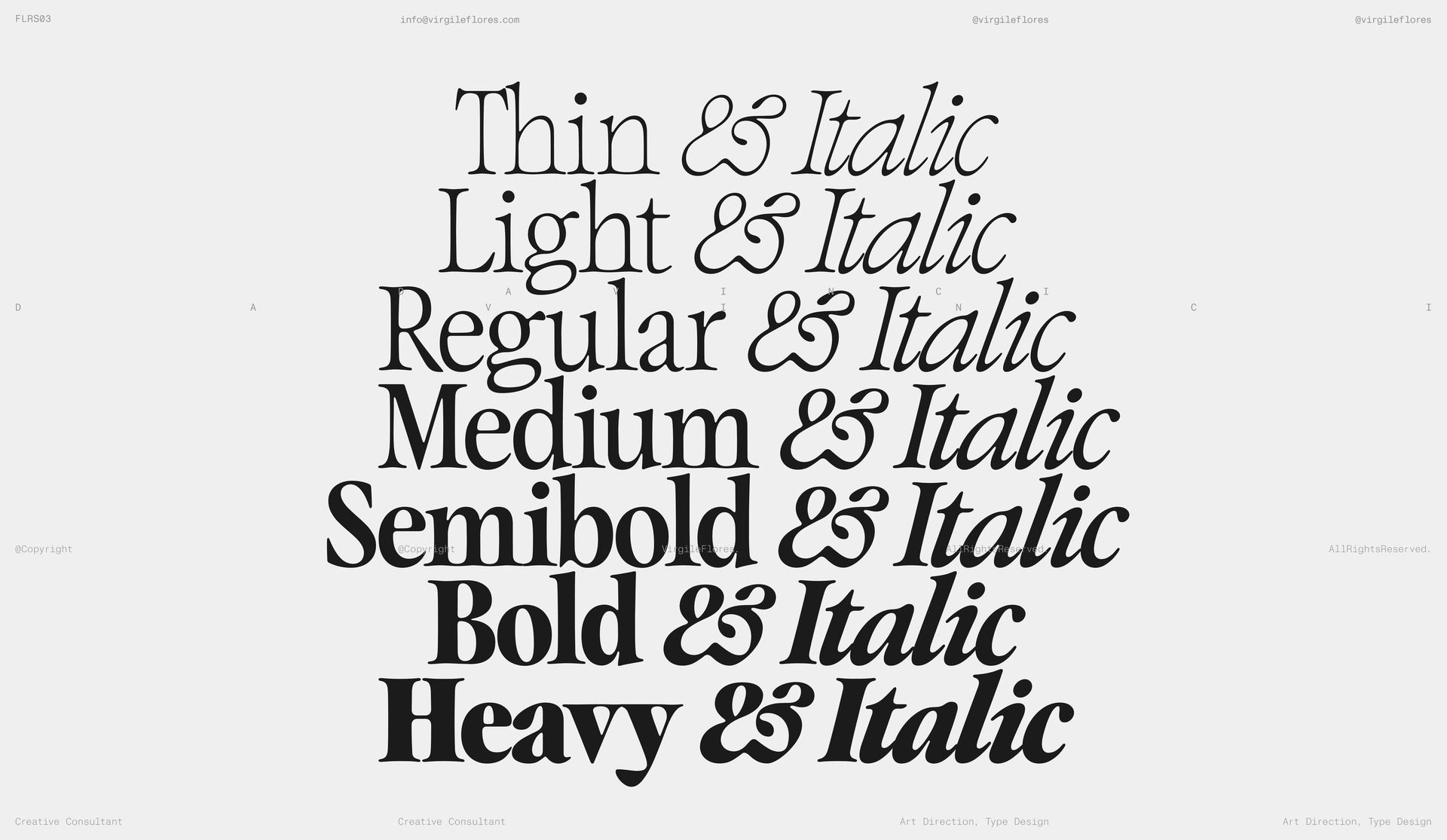 DaVinci was recently updated with italic styles, and they were absolutely worth the wait, featuring many swash alternates. “I can’t believe it took me six years to finally complete the full DaVinci family,” says designer Virgile Flores, a NYC-based creative working at the intersection of fashion, art, and music. These influences are visible throughout the typeface, with glyphs flowing gracefully into one another to create dynamic movement.
