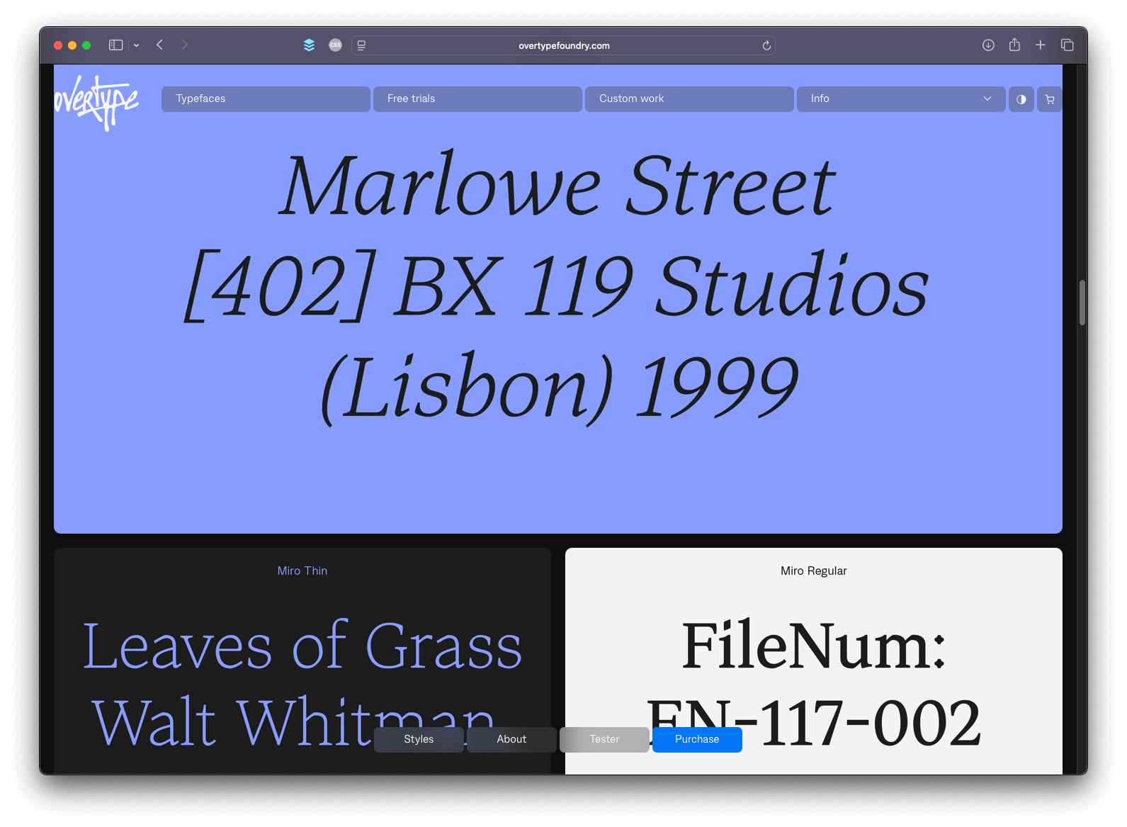 New foundry alert! Overtype is the new independent type foundry of Inès Davodeau and Tim Vanhille. The website launched with a starting catalogue that includes two retail typefaces: a serif and a sans-serif. My preference goes to the serif, Miro, which combines classic elegance with a raw, expressive edge—featuring subtle breaks and distinctive details that give it personality and depth. Miro is a great choice for long-form text, editorial projects, and striking logotypes.